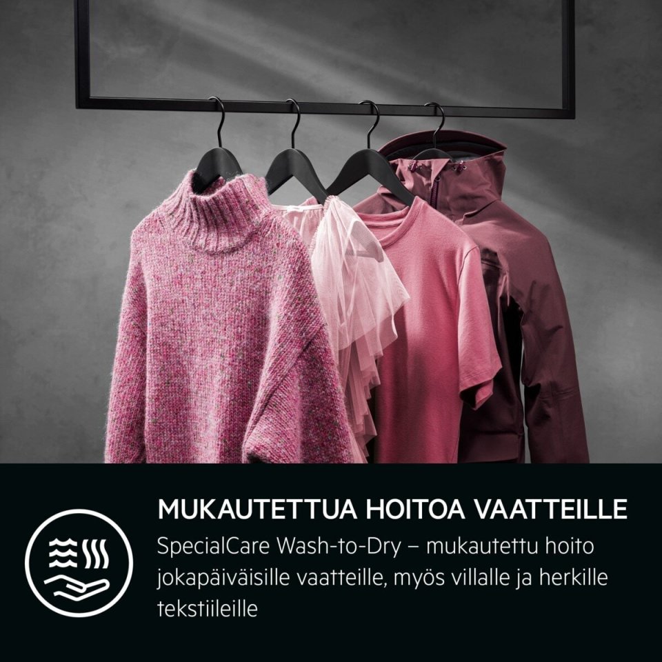 SpecialCare Wash-to-Dry lets you wash and dry your clothes with a single program. It adjusts settings based on fabric type to provide gentle yet effective cleaning and drying. The machine is Woolmark Blue certified, ensuring safe care for wool and outdoor garments.