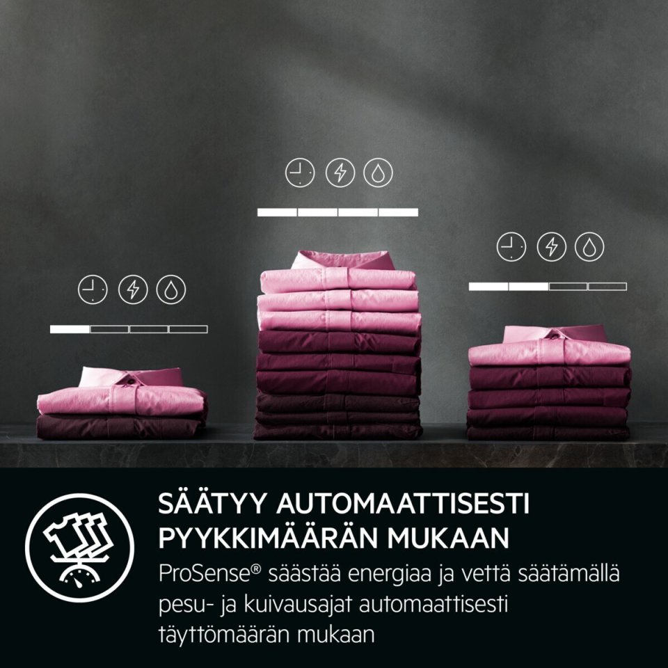 The AEG 7000 ProSteam washer-dryer combines effective washing, gentle drying, and steam refreshing in one appliance. It offers smart garment care that saves space, time, and protects your clothes.