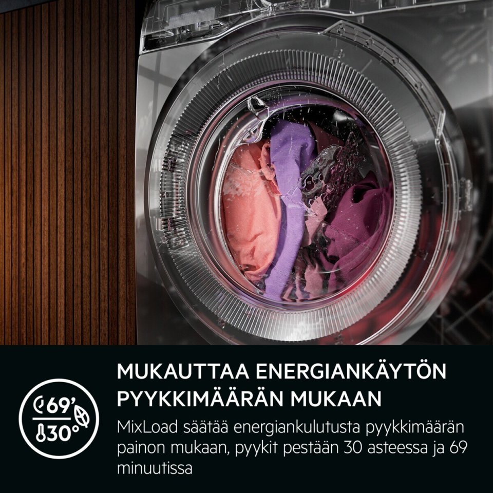 The MixLoad 69 min program washes cotton and synthetic fabrics together at 30 °C. Energy use adjusts automatically according to the load size.
