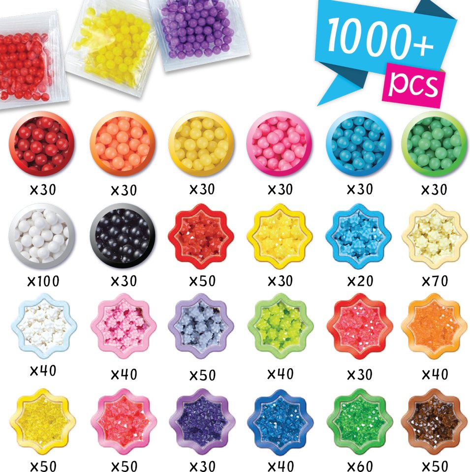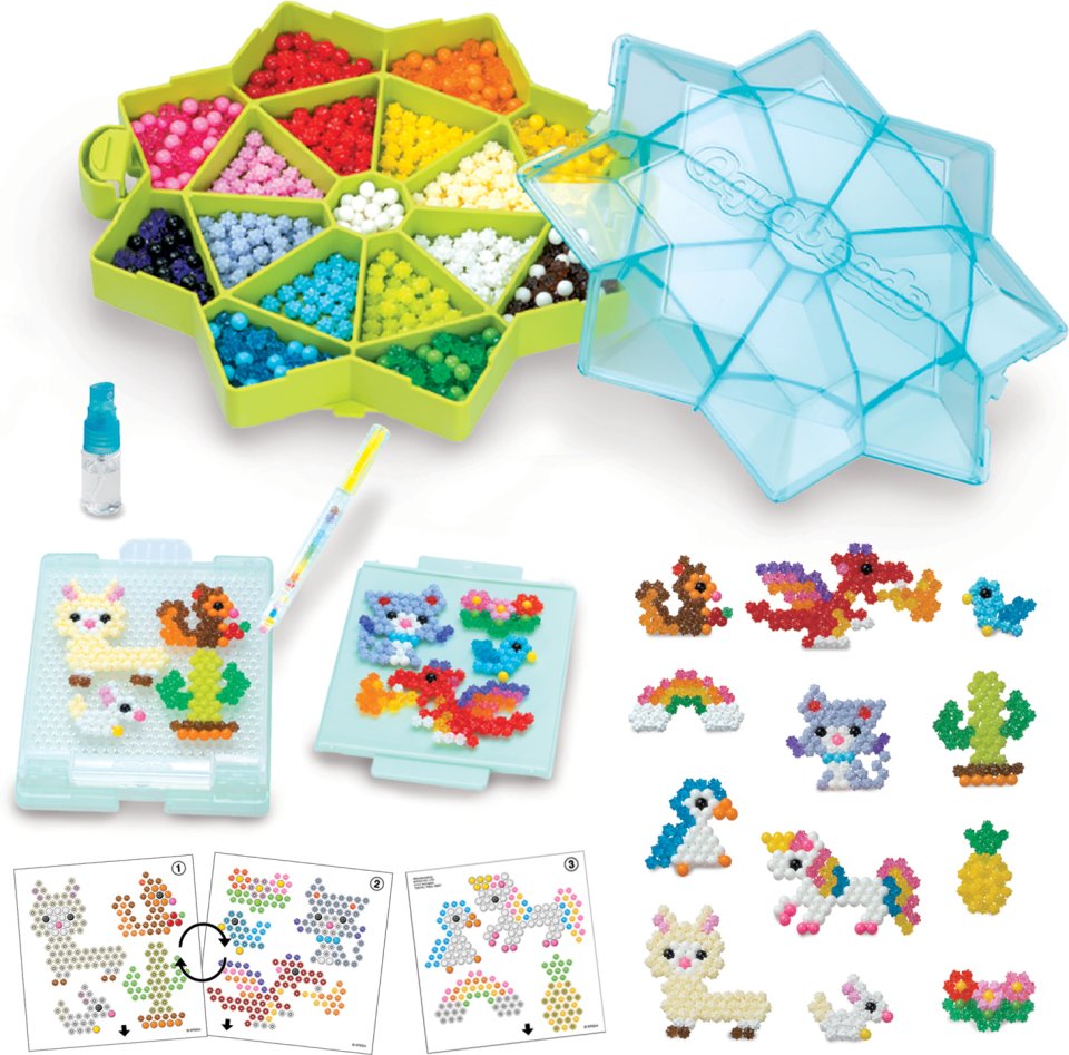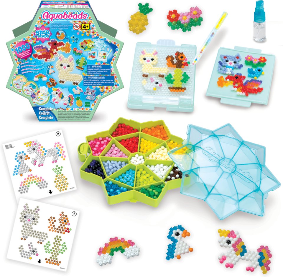 The new Aquabeads star beads are unique star-shaped beads that are compatible with all other Aquabeads. With these, you can create things like a fluffy coat for an animal or even more detailed models. The starter pack includes an innovative flip base, a storage box for star beads, a sprayer, a 2-in-1 bead pen / bead picker, over 1000 colorful crafting beads in 24 different colors, and matching design templates. Aquabeads stick together magically – similar to ironing beads, but without the need for ironing; just a spray of water will do the trick!