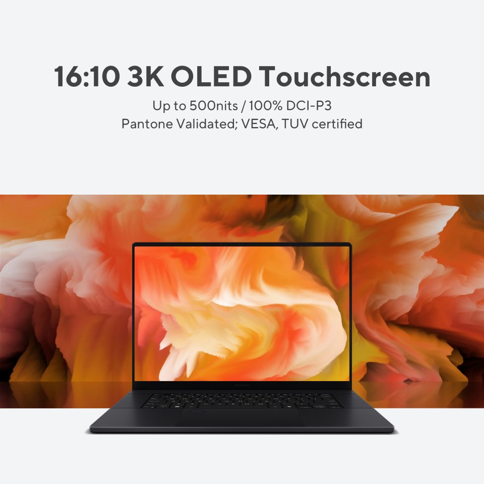 • Display: 16″ 3K OLED (2880 x 1800) 16:10, touchscreen, 120 Hz refresh rate, 0.2 ms response time, 400 nits brightness (500 nits HDR), 100% DCI-P3 color gamut, 1,000,000:1 contrast ratio, 1.07 billion colors, VESA DisplayHDR True Black 500, Pantone Validated, TÜV Rheinland and SGS certified, glossy finish, 88% screen-to-body ratio