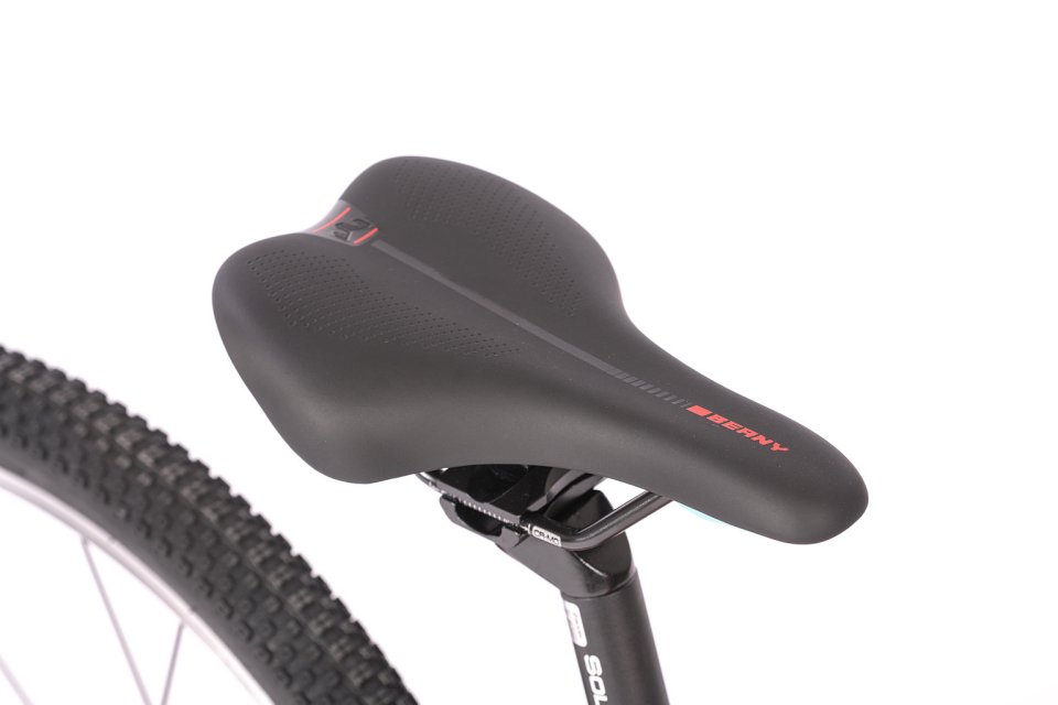 The bike frame is made of triple butted 6061 aluminum, making it light yet durable. The front fork is also aluminum, and its structure supports the bike’s agility and maneuverability.