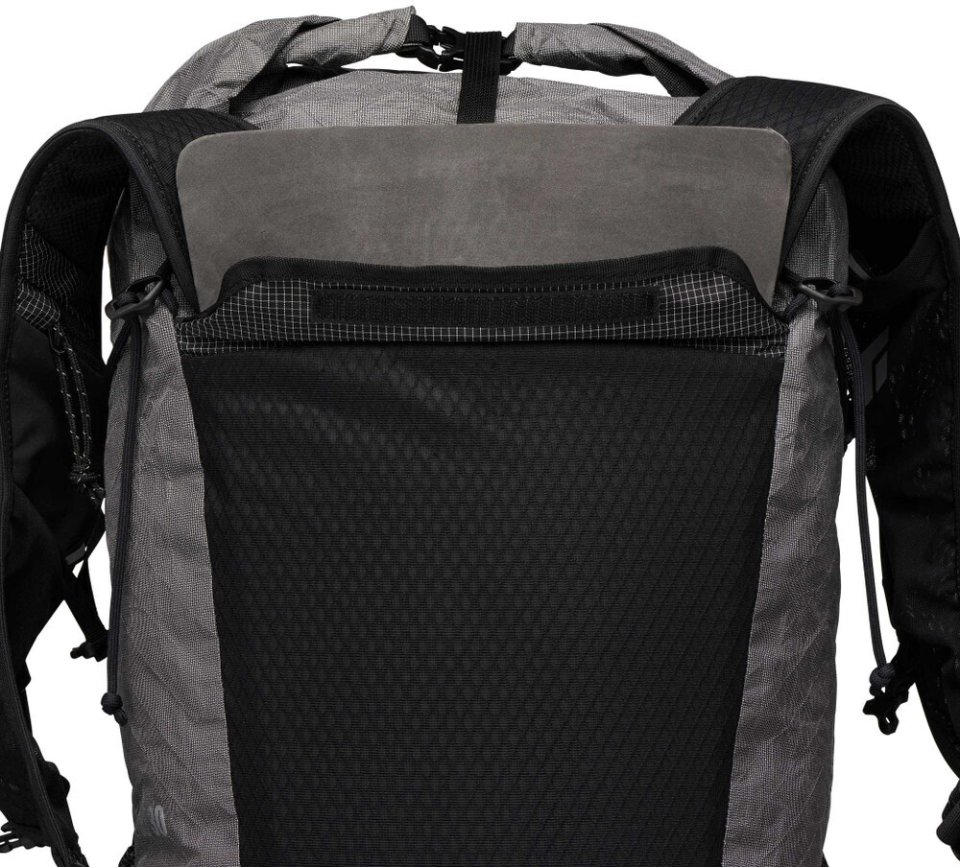 The vest-style carrying system, inspired by running backpacks, distributes the weight evenly and keeps the backpack firmly in place. The shoulder straps also have additional pockets, for example, for snacks. The detachable hip belt also features zippered pockets on both sides. The support plate that adds stability to the backpack is also removable. Fully equipped, the backpack weighs only 695 g. Without the support plate and hip belt, the backpack weighs just 452 g.
