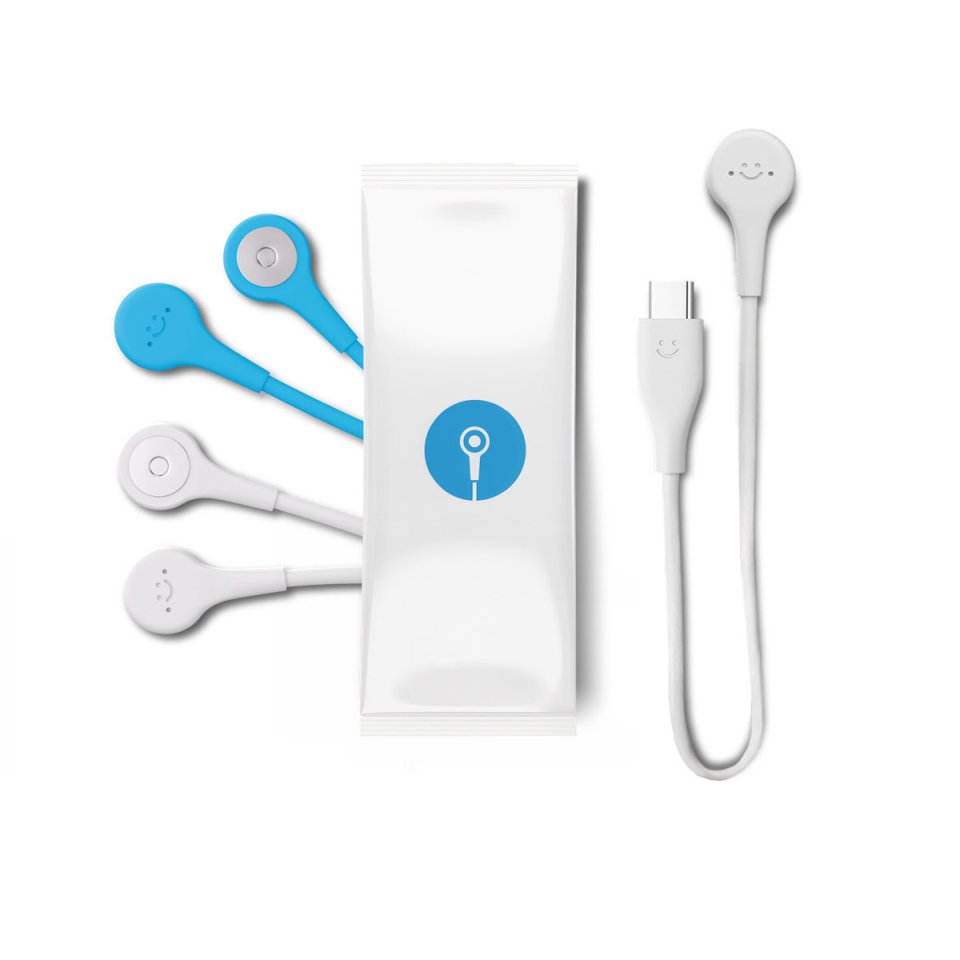 The device is charged with a USB-C cable included in the package. Additionally, you receive two electrode cables and eight electrode sets, containing four square and four rectangular electrodes. A storage pouch keeps the device and accessories organized.