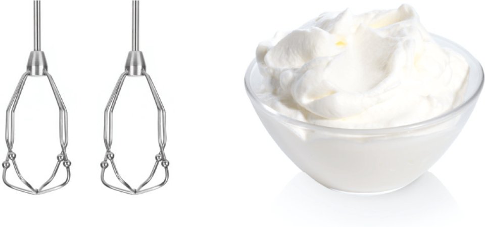 • Two innovative, highly efficient stainless steel whisks (Fine Creamer) for optimal whipping and mixing results.