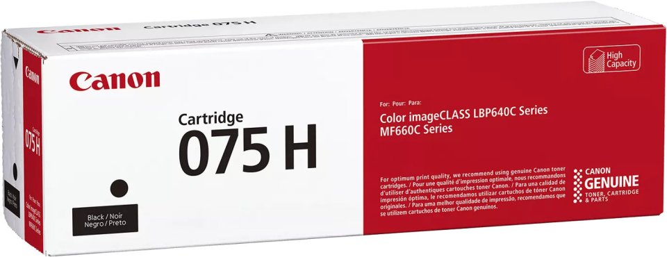 The Canon 075 H is a black toner cartridge designed for use with Canon laser printers. It fits several models including the MF665Cdw, MF663Cdw, MF662Cdw, LBP647Cdw, and LBP646Cdw, providing reliable black text and image printing.