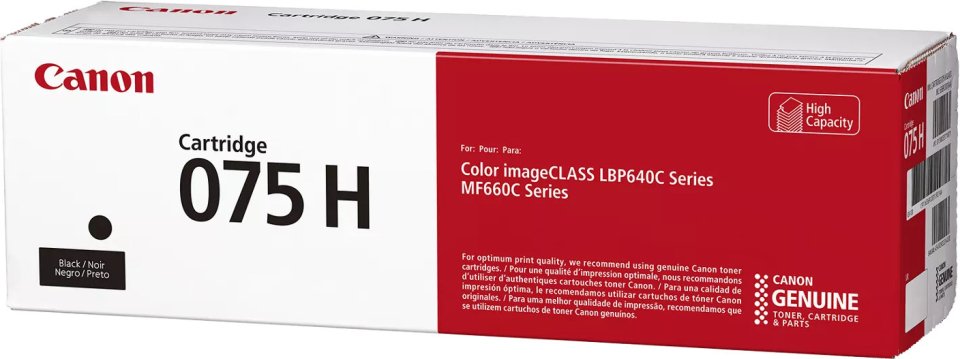 The package includes one black Canon 075 H toner cartridge ready for installation.