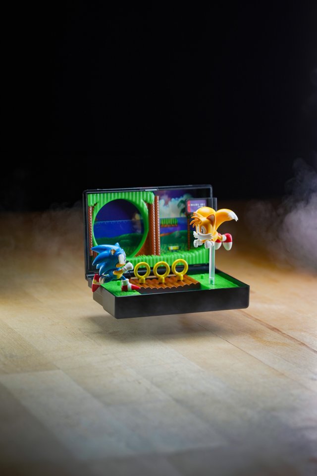 The diorama includes miniature figures of Sonic and Tails, as well as a buildable scene with molded and attachable parts that can be used for both display and play.