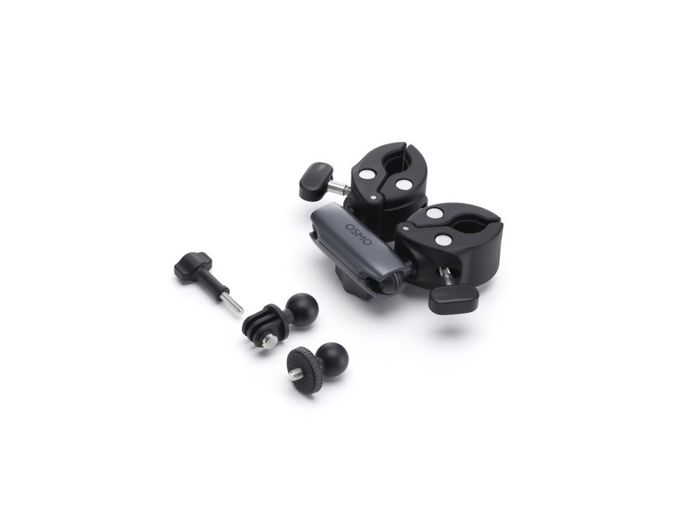The DJI Osmo Dual Heavy-Duty Clamp is designed to facilitate filming in dynamic situations, offering the stability and versatility needed to capture third-person angles while motorcycling.