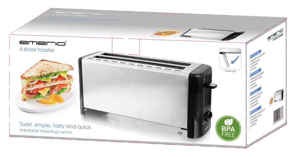 This four-slice toaster combines a sleek design with practical features to make your breakfast moments more enjoyable. With six adjustable browning levels, you can control the exact shade of toast you prefer. The automatic centering function ensures even toasting on both sides of your bread.