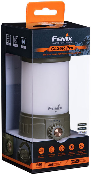 • Package Includes: CL26R PRO camping lantern, Fenix ARB-L21-5000 (5000 mAh) Li-Ion battery, USB-C cable, replaceable O-ring seal, user manual.