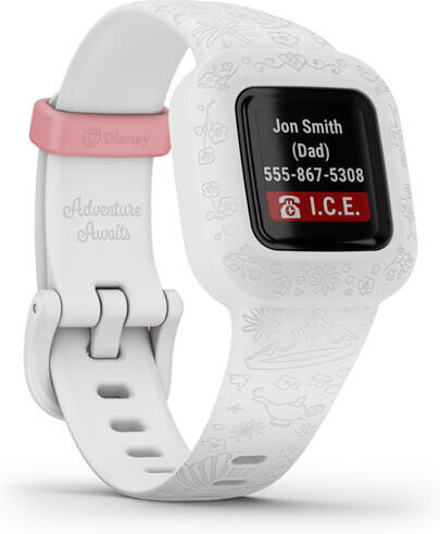 The Vivofit jr. 3 is more than just a kids' activity tracker. It is an interactive experience where a child's activity unlocks enchanted Disney Princess app adventures. The durable activity tracker is swim-friendly, making it perfect for your child's adventures. Whether you're a world traveler, princess, or superhero: the educational adventures of the Vivofit Jr 3 are personalized to match the watch's style.