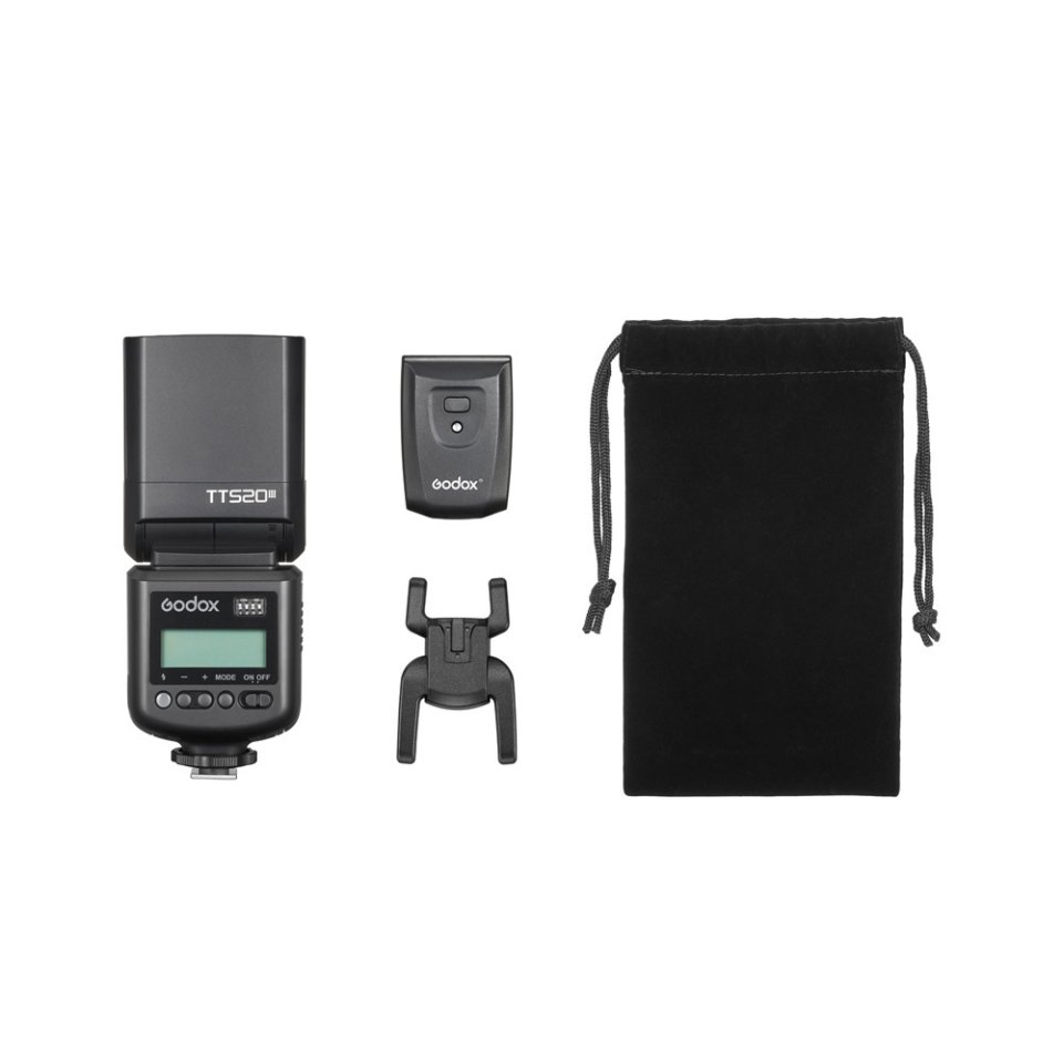 The flash and accessories come in a practical carrying pouch that protects the gear and simplifies transport.