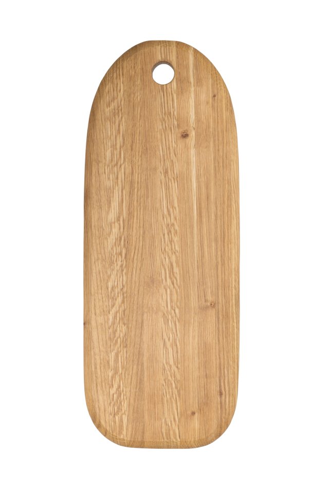 This long, narrow oak cutting board is ideal for both cutting and serving. Its elegant shape makes it a good choice for presenting bread or cheese. It’s also well suited for slicing fish. The natural wood surface adds warmth to your kitchen and stands up to regular use.