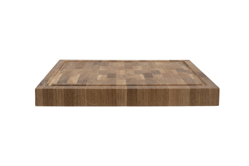 The cutting board is crafted from solid oak with grains positioned opposite each other. This technique enhances its strength and longevity, making it a reliable tool for everyday kitchen tasks.