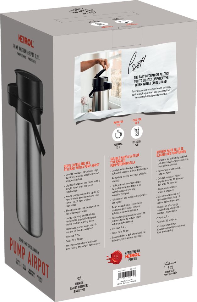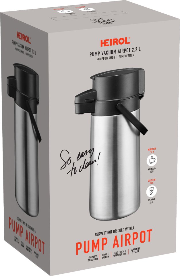 The Heirol pump thermos is designed for serving coffee and tea with ease and style. Its stainless steel interior and double vacuum insulation with a silicone seal keep drinks hot for up to 12 hours or cold for up to 24 hours when preheated or precooled. You can pour your drink smoothly with one hand, and the button locks securely for transport. The wide opening and removable inner lid with a tube make cleaning simple. Hand wash after each use; this thermos is not dishwasher safe.