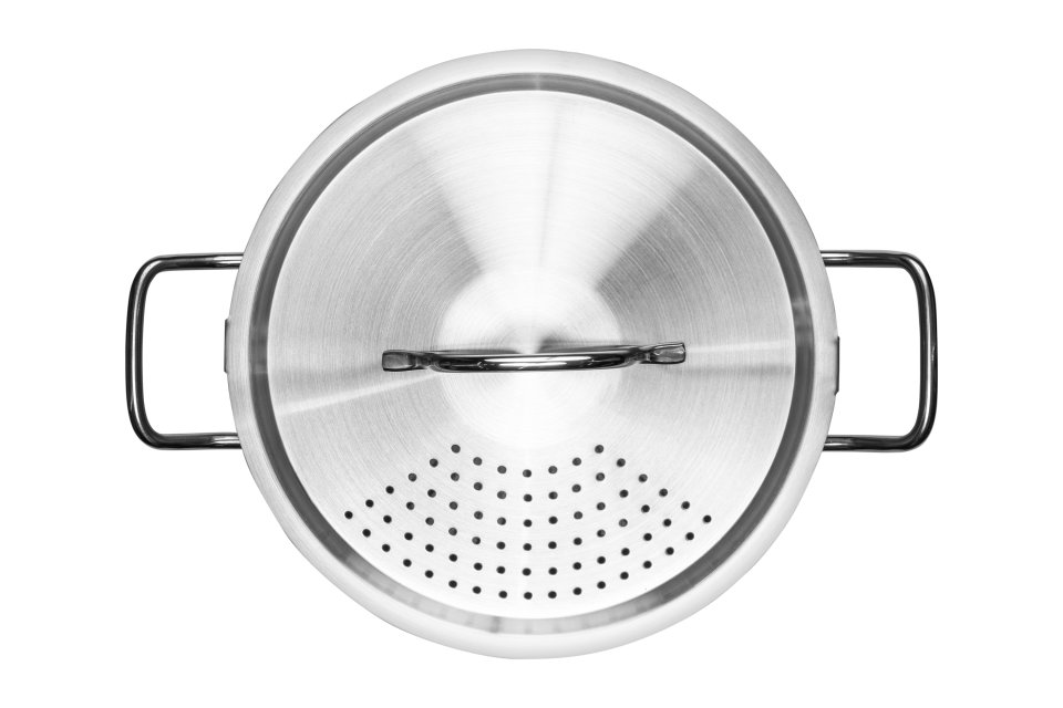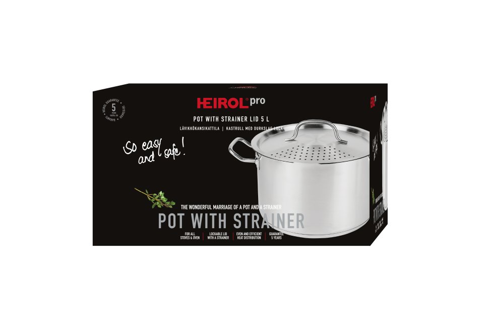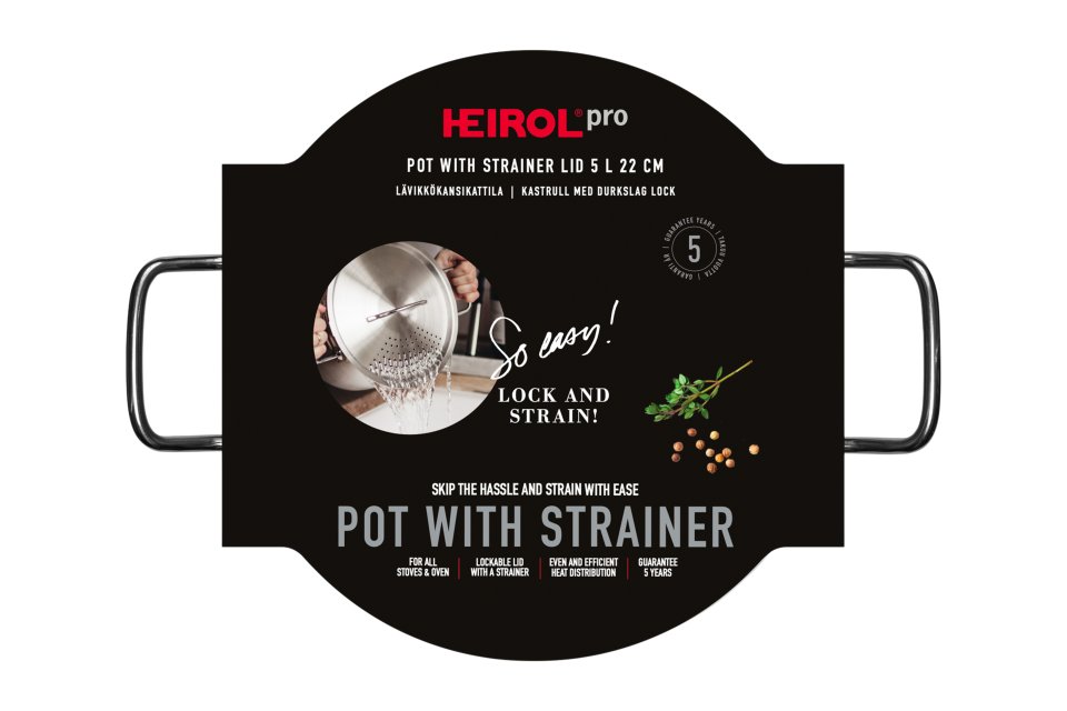 The versatile Heirol pot with an integrated strainer simplifies everyday cooking. Its innovative locking lid doubles as a practical colander, so you no longer need a separate sieve. You can easily drain cooking water from vegetables, potatoes, or pasta directly from the pot. It works on all stovetops, including induction. The interior measurement marks help you accurately portion your ingredients, while the steel base with a encapsulated aluminum plate ensures even and efficient heat distribution.