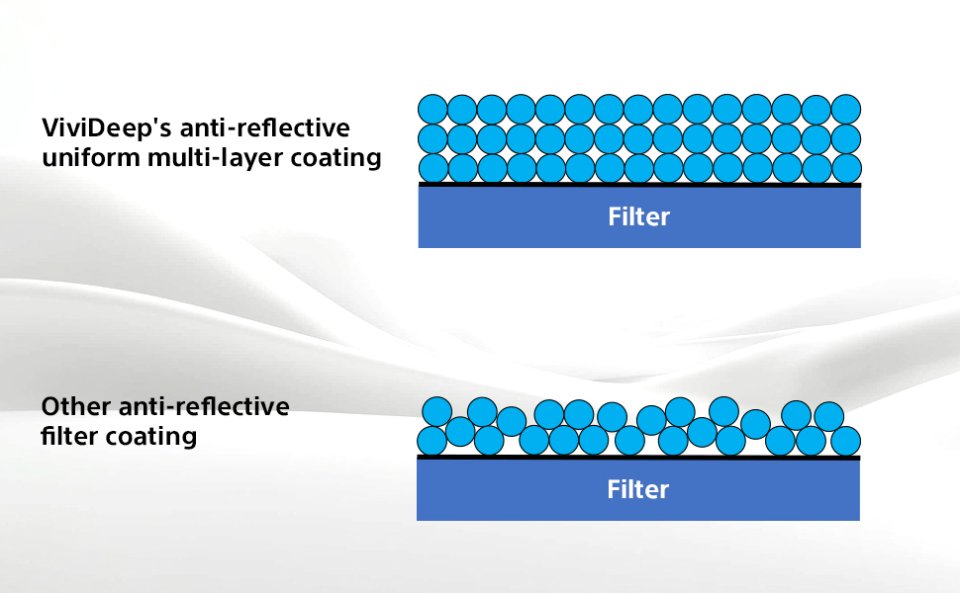 The ViviDeep Filter helps reduce reflections and glare caused by ambient light. This improves visibility especially in bright rooms or outdoors, keeping the screen content clear without extra distractions.