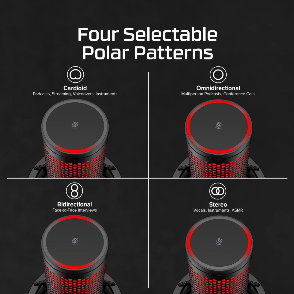 The QuadCast 2 supports cardioid, stereo, bidirectional, and omnidirectional polar patterns, allowing you to choose the best recording mode for the situation. This makes the microphone suitable for solo speech, interviews, and group discussions alike.