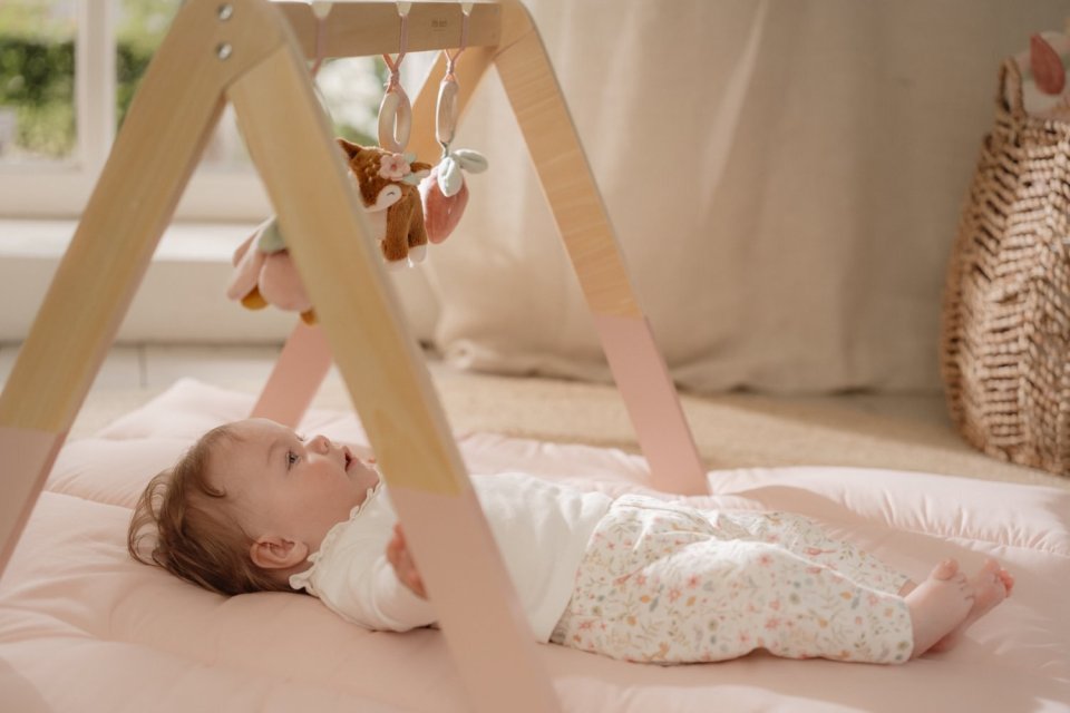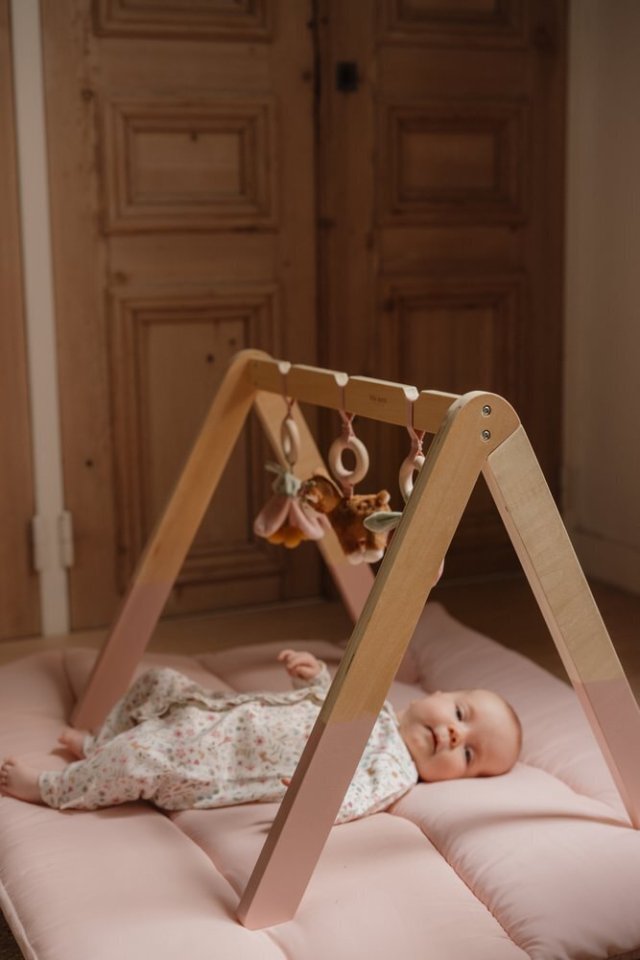 This wooden baby gym offers engaging play with three different activity toys, including a charming deer, a colorful flower, and a strawberry. It supports hand-eye coordination, motor skills development, and sensory stimulation as your little one reaches for and interacts with the toys.