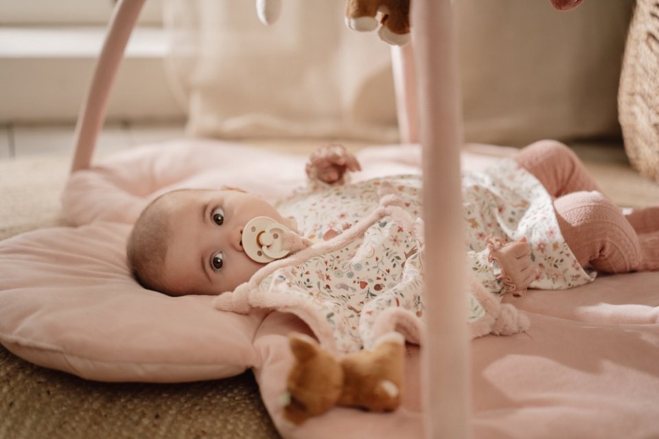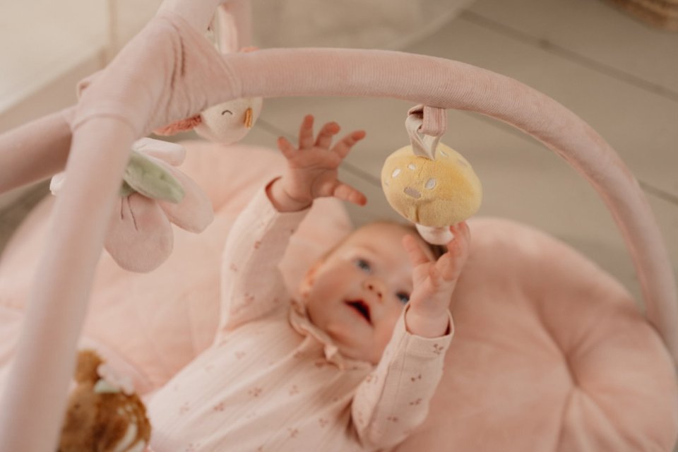 Every day becomes an adventure with this flower-shaped play mat. In a soft pink shade, it features two velvety arches and five different hanging soft toys. A small deer, bird, flower, mushroom, and strawberry help develop sensory skills as well as hand-eye coordination. The mat measures 90 x 90 x 48 cm. It is made using recycled GRS-certified materials.