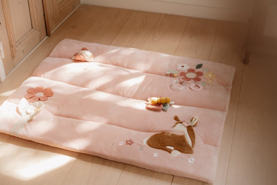 This padded play mat playfully stimulates your child's senses with its various textures and activities. Embark on an adventure to discover rustling leaves, meet the sweet soft fawn, and play with the butterfly and little bird.