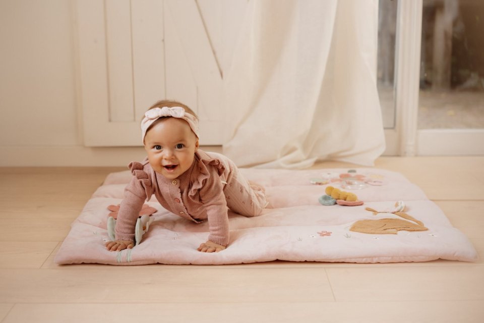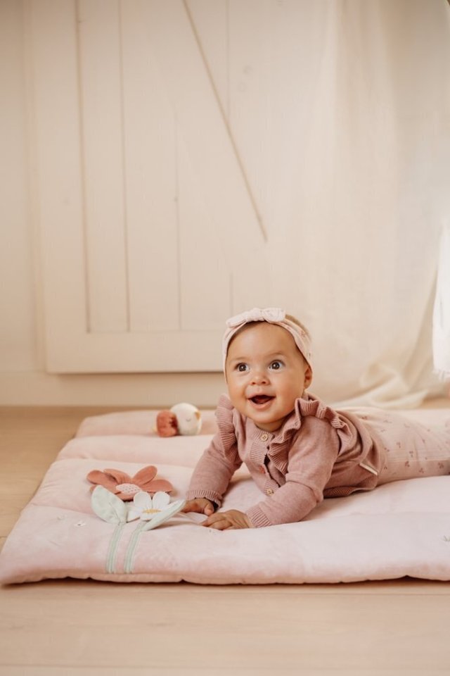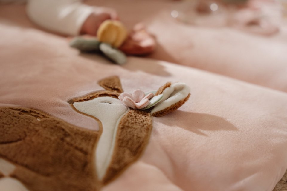 This padded play mat playfully stimulates your child’s senses with its various textures and activities. Embark on an adventure to discover rustling leaves, meet the sweet soft fawn, and play with the butterfly and little bird.