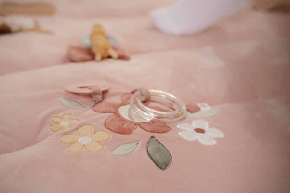 It also includes a small mirror for self-exploration and a transparent ring with three small beads that rattle when moved. The play mat measures 31.5 x 39.4 inches and is made from recycled GRS material.