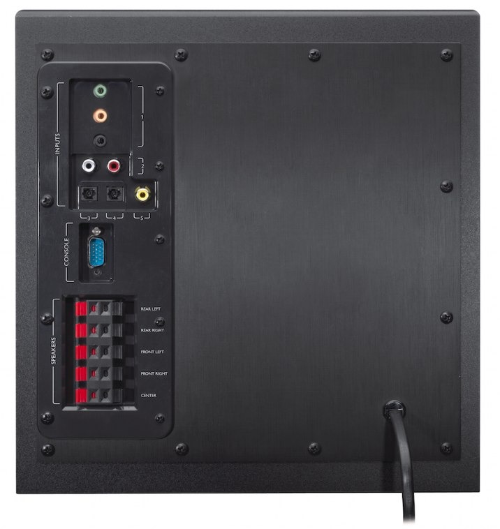• Additional features: THX-certified speakers, Dolby Digital 5.1 decoding, DTS decoding, 3D Stereo function (surround sound from two-channel sources), control unit (stackable), four satellite speakers (wall-mountable), center speaker (wall-mountable), subwoofer with side-firing element, remote control