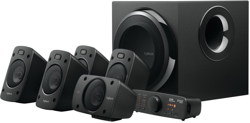 The Logitech Speaker System Z906 is the flagship home theater speaker system that delivers 5.1 surround sound with a staggering total power output of 500 watts (RMS). The speakers are also THX-certified, ensuring the listener an authentic movie theater-quality sound experience in their living room. The Logitech Z906 plays detailed Dolby Digital or DTS soundtracks using its digital decoder and also converts two-channel stereo audio into immersive surround sound. The living room-shaking bass is powered by a 165-watt subwoofer amplifier. The Logitech Z906 is designed to be versatile to fit as many living rooms as possible. You can connect up to six audio devices simultaneously to the home theater speakers. These can include, for example, a TV, DVD player, set-top box, Blu-ray player, game console, or computer. Inputs include optical, RCA, and 3.5-millimeter connections. The clear display and stackable design make the control unit a stylish addition to home entertainment systems. The wireless remote control allows you to manage the listening experience directly from the couch, and the wall-mountable satellite speakers turn your living room into a home theater.