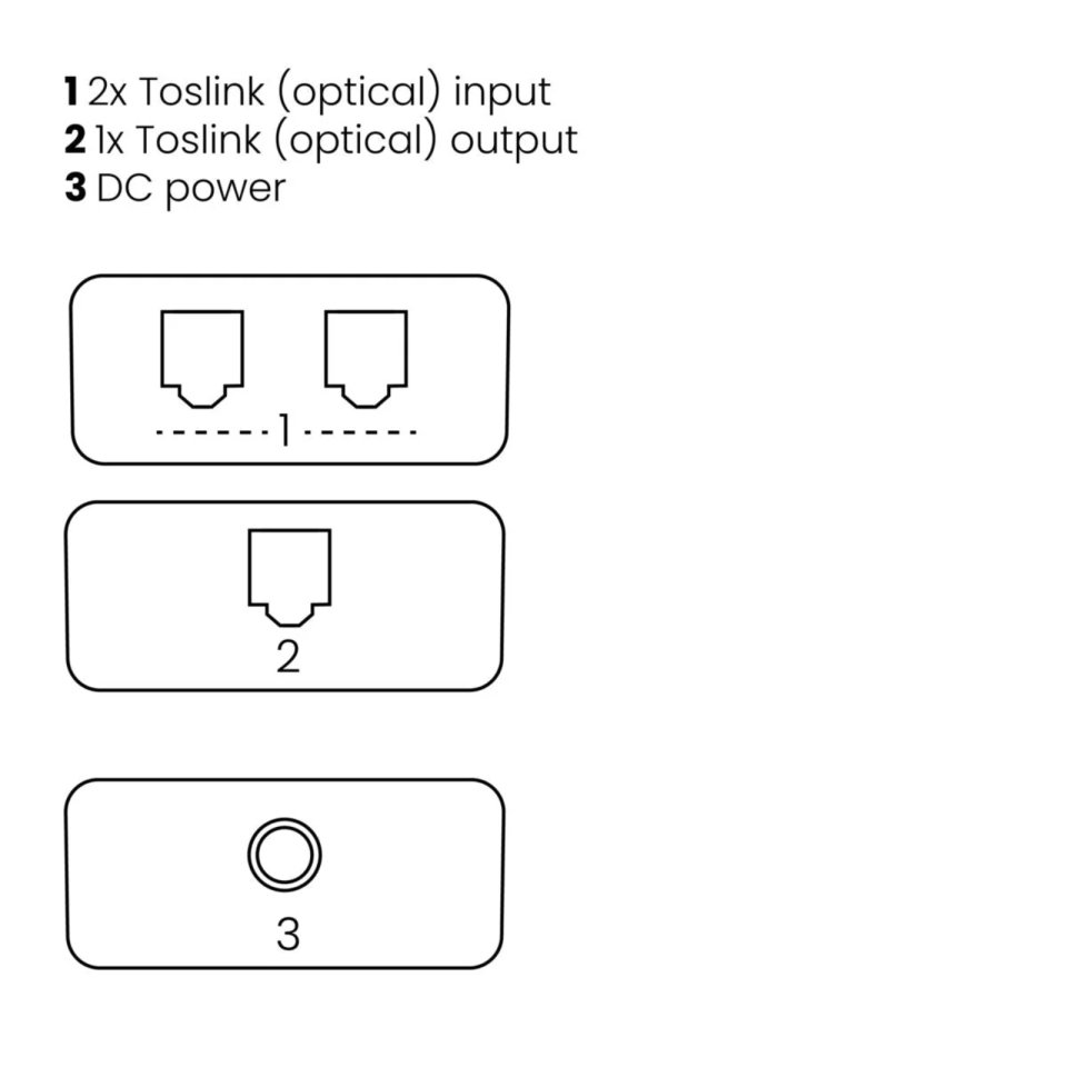 The TS21E features two optical inputs and one optical output, allowing you to connect multiple digital audio devices to one receiver. It supports both S/PDIF and Toslink standards, ensuring broad compatibility with various devices. This makes it a practical solution for connecting TVs, gaming consoles, or other digital audio sources.