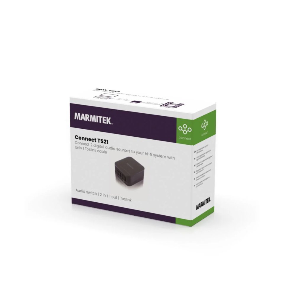 The Marmitek Connect TS21E is a digital audio switch that easily combines two optical audio sources into a single optical digital input. It’s designed for situations where your amplifier or active speakers don’t have enough digital inputs. The switch operates without delay or loss of sound quality, delivering clear and precise audio. It supports sample rates up to 192 kHz, making it compatible with a wide range of audio sources and systems.