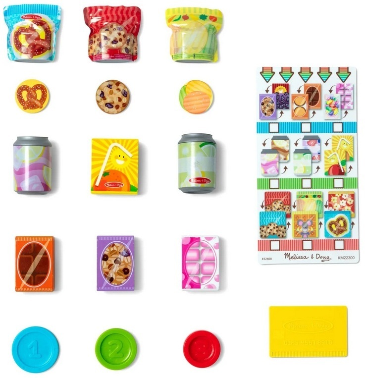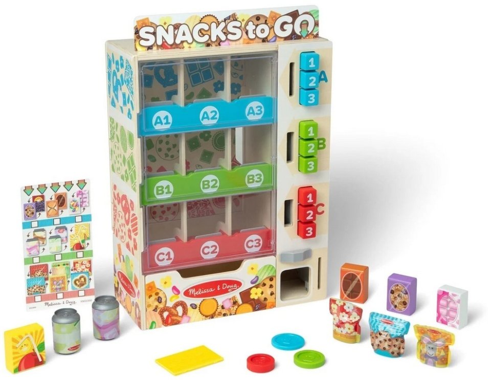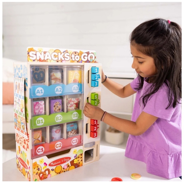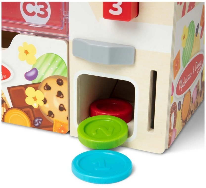 Discover a wooden vending machine playset that lets kids sort pretend snacks, load shelves, insert play coins, and press buttons to release their chosen item into the collection box. It works like a real vending machine, offering hands-on fun without batteries.