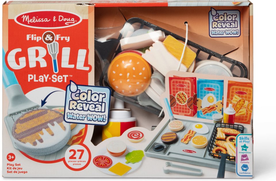 Water turns the play foods from “raw” to “cooked.” Add water on top of the play foods with a spatula, sauce bottle, or salt shaker, and the colors of the foods darken, becoming “cooked.” It feels and looks like you’re actually cooking, taking cooking play to a whole new level! Make eggs and bacon for breakfast, and for lunch, you could grill a delicious hamburger!