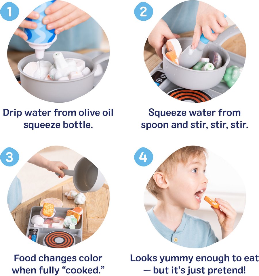 Add water, stir, and be amazed as the food "cooks" before your eyes. The playset includes a Water WOW! spoon for dispensing water, a play stove, a pot for stirring food, an oil/water bottle, Water WOW! vegetables and protein sources that change color. It feels and looks like you’re actually cooking, taking cooking play to a whole new level!
