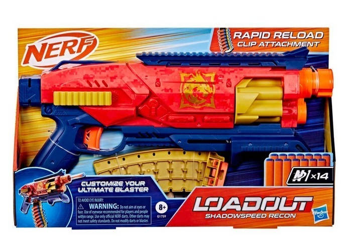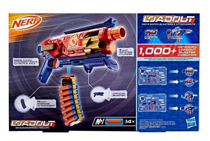 The Shadowspeed Recon blaster comes with 14 Nerf N1 darts designed for extreme accuracy, speed, and range. Collect all Nerf Loadout blasters (each sold separately, subject to availability) to endlessly combine their gear.