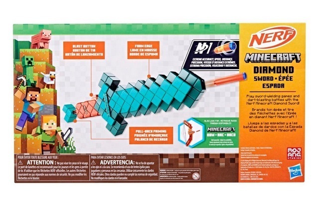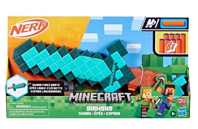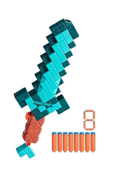 The Nerf Minecraft Diamond Sword comes with 8 official Nerf N1 darts, which are incredibly accurate, fast, and fly far. The toy blaster can be loaded with one dart at a time and features a foam sword blade and a pull-back priming handle. Press the button to shoot a dart at your opponent.
