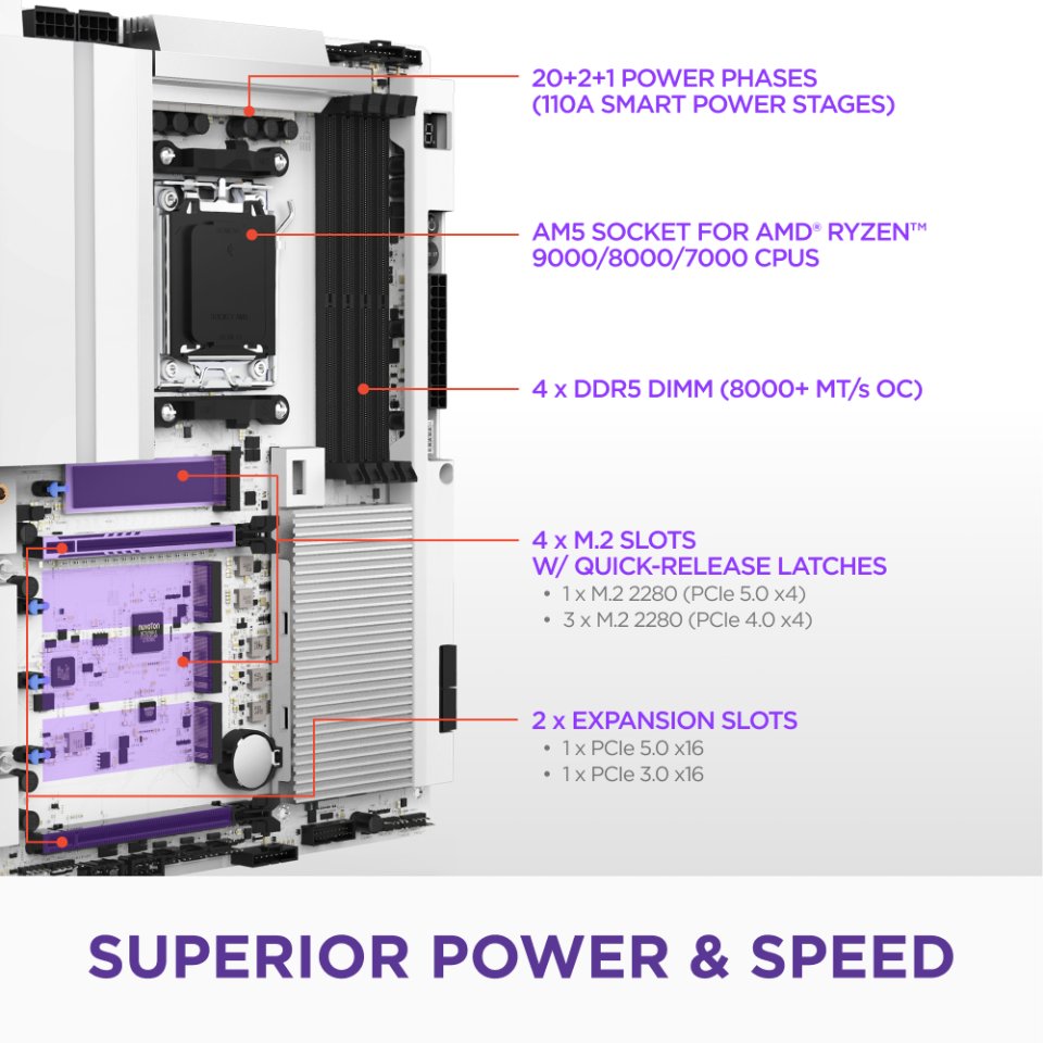 The NZXT N9 X870E is an ATX-sized motherboard designed for AMD’s latest Ryzen 7000, 8000, and 9000 series processors with an AM5 socket. It supports DDR5 memory with four DIMM slots in a dual-channel configuration. The motherboard features the AMD X870E chipset, which offers stable performance and versatile connectivity, including PCIe 5.0 support and fast storage interfaces.
