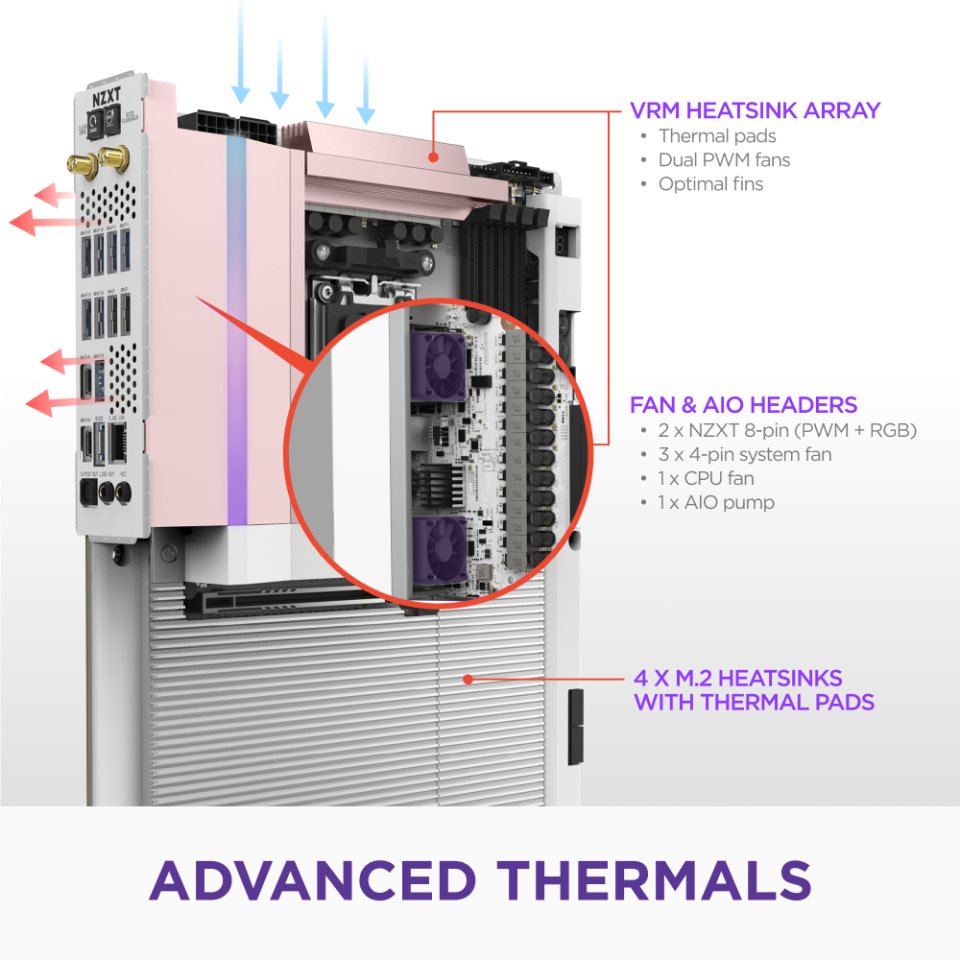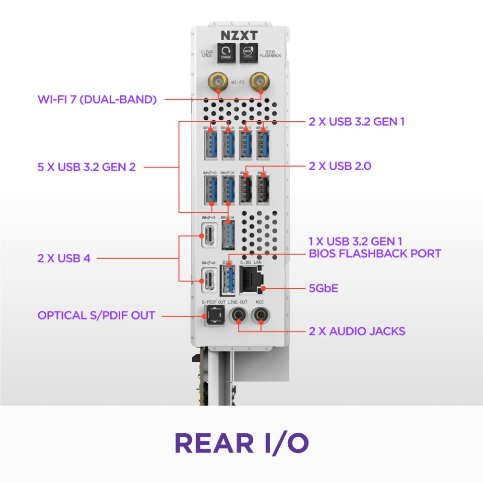 The NZXT N9 X870E supports DDR5 SDRAM, providing faster and more efficient memory usage. Four DIMM slots allow for memory expansion as needed. Storage can be expanded with one M.2 slot and four SATA III ports, supporting both SSD and HDD drives.