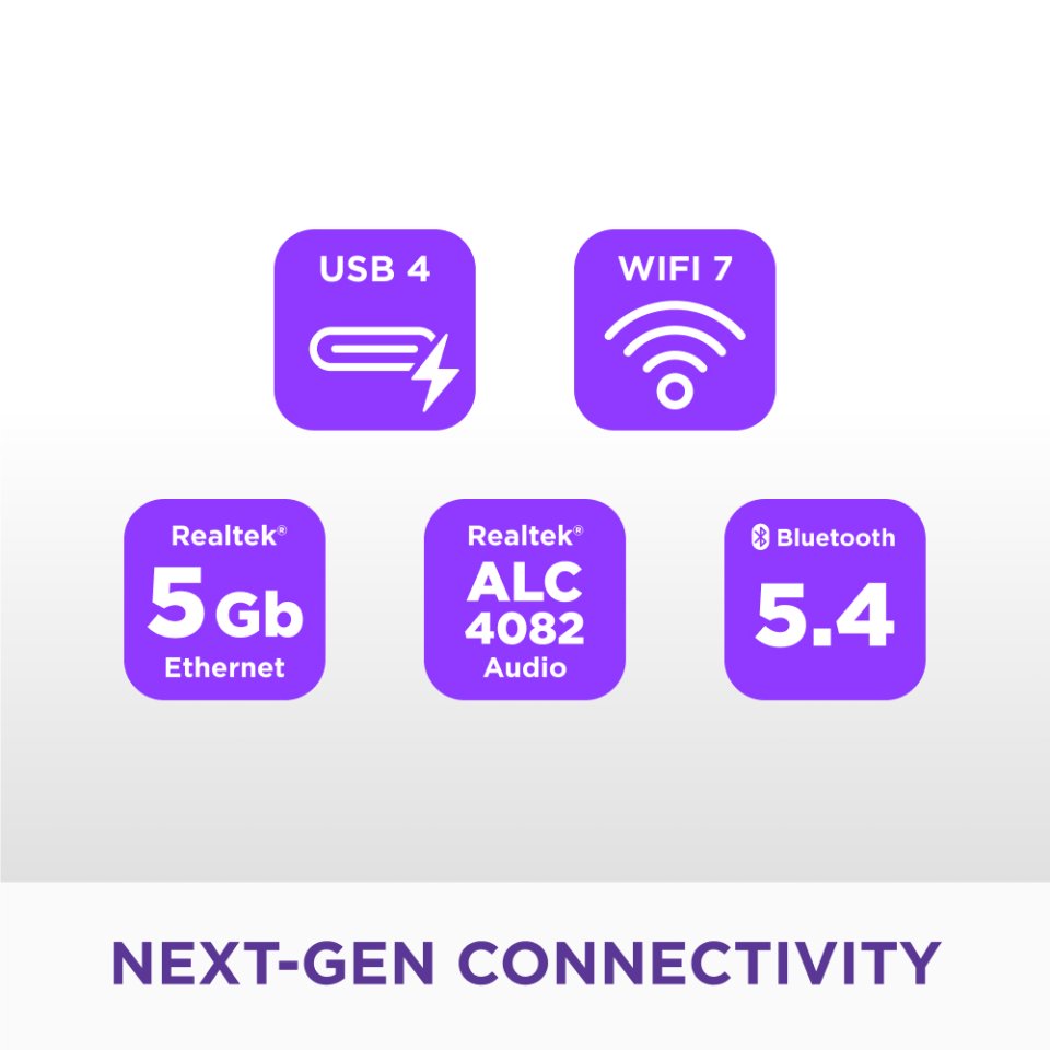 The motherboard offers versatile USB ports: two USB 2.0 ports, three USB 3.2 Gen 1 Type-A ports, five USB 3.2 Gen 1 Type-C ports, one USB 3.2 Gen 2x2 port, and two USB4 Gen 3x2 ports. Network connections are handled via a 5 Gigabit Ethernet port and Wi-Fi 7 connectivity, providing fast wireless networking. Bluetooth 5.4 is also supported for wireless devices.