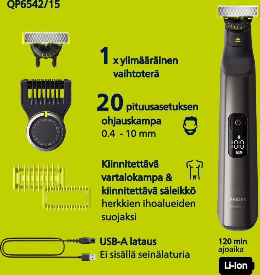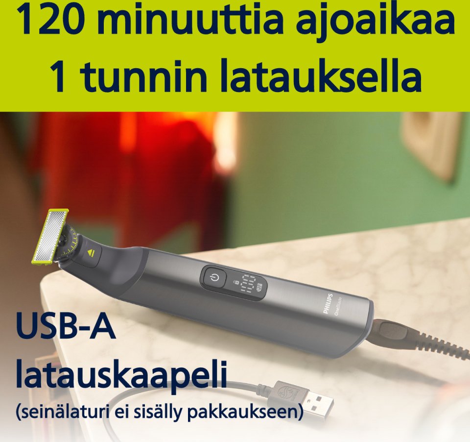 The rechargeable Li-Ion battery provides 120 minutes of shaving time with a 1-hour charge. Charges via USB-A cable, included in the package.