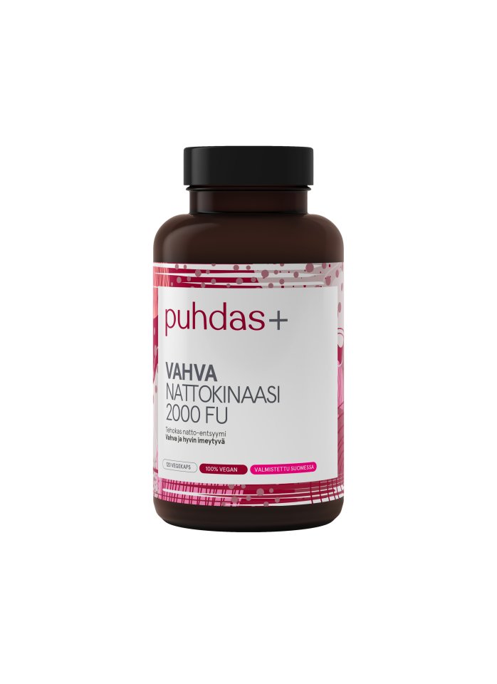 Puhdas+ Nattokinaasi is a high-quality Finnish dietary supplement featuring nattokinase, an enzyme derived from the traditional Japanese natto dish. This product contains no added preservatives or colorants, ensuring a pure and natural formula.