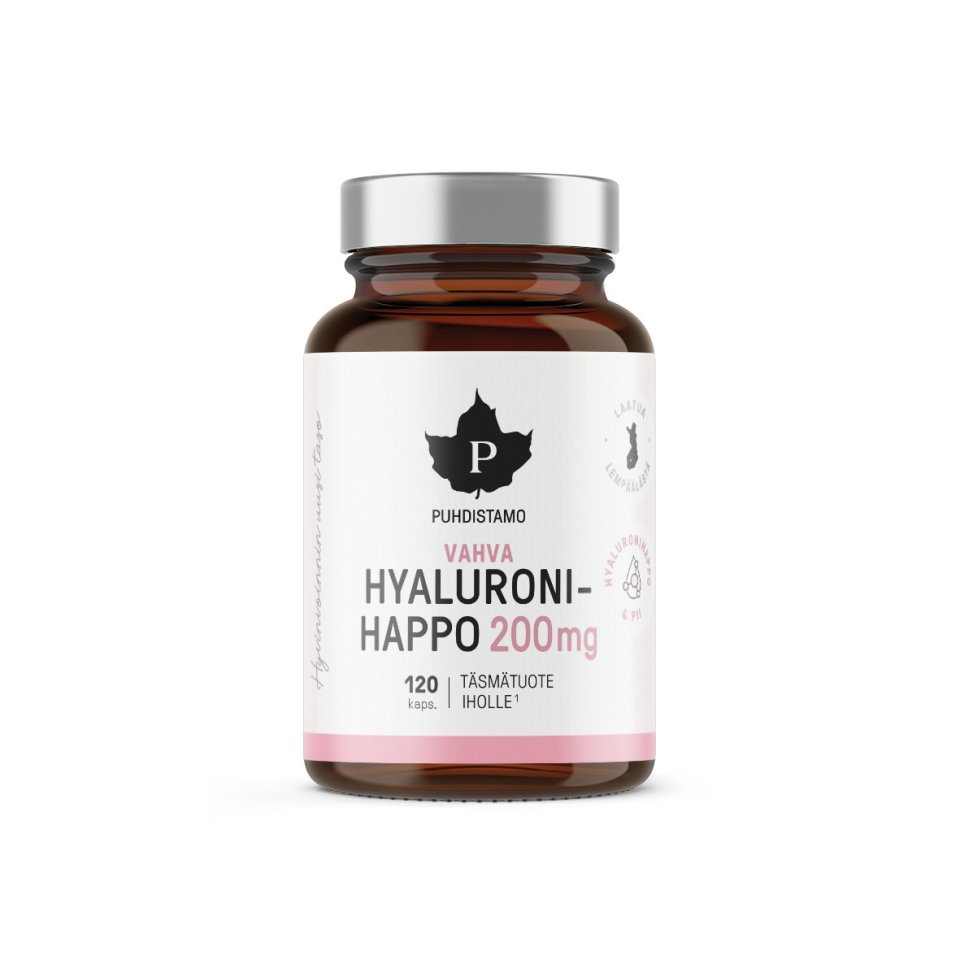 Puhdistamo's Strong Hyaluronic Acid contains 200 mg of hyaluronic acid. In addition, the product contains vitamin C and horsetail extract, which is a natural source of silica. Vitamin C contributes to collagen formation for the normal function of the skin and helps protect cells from oxidative stress. Free from additives and fillers. Developed and manufactured in Finland.
