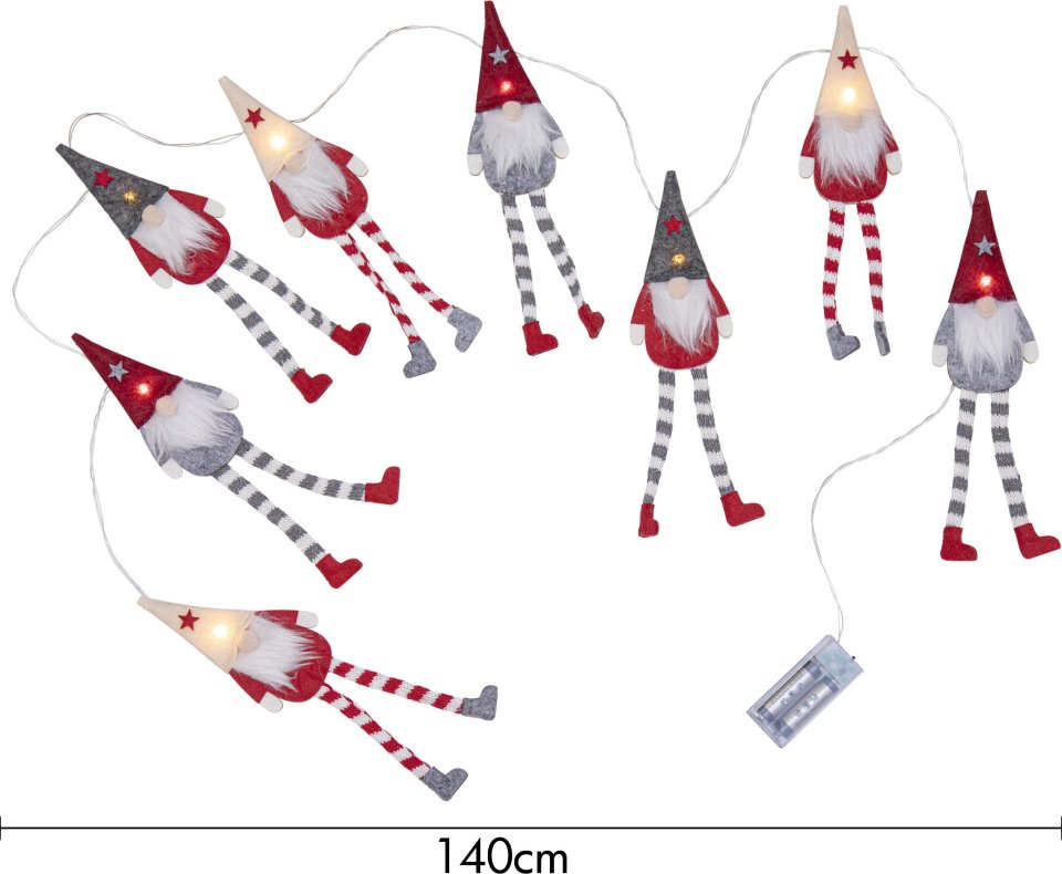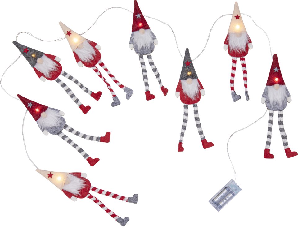 Star Trading 729-86. Tuotetyyppi: Koristevaloketju, Tuotteen väri: Harmaa, Punainen, Valkoinen, Kotelon materiaali: Metalli. Lamppujen lukumäärä: 8 lamppu(a), Lampun tyyppi: LED, Kokonaisteho: 0,1 W. Virtalähteen malli: Akku, Akkutyyppi: AA. Tuotteen korkeus: 240 mm, Tuotteen leveys: 140 mm, Tuotteen syvyys: 67 mm. Lukumäärä per pakkaus: 1 kpl