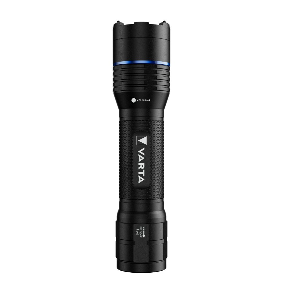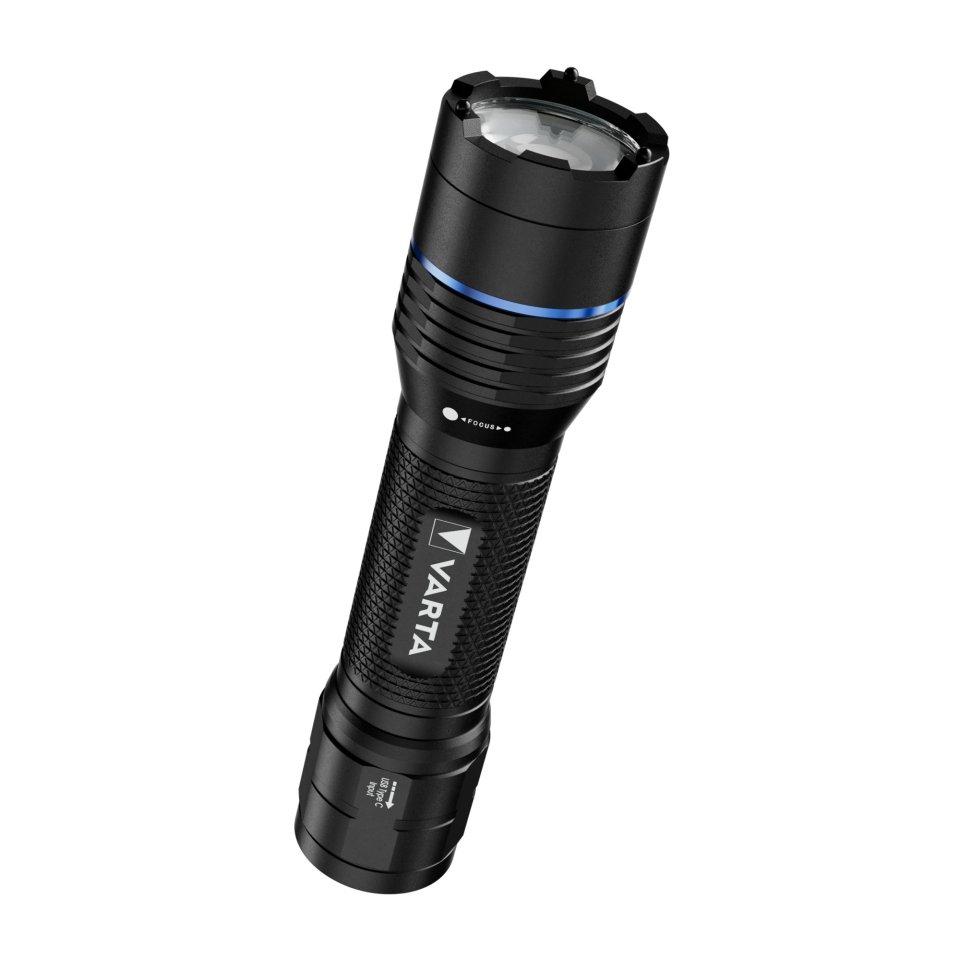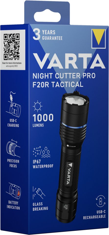 The VARTA Night Cutter Pro F20R Tactical is a rechargeable LED flashlight delivering 1000 lumens of brightness with a durable design. Its aviation-grade aluminum body makes it shock-resistant and waterproof with an IP67 rating. The flashlight features adjustable focus, allowing you to switch from a narrow spotlight to a wide floodlight. It also includes a handy strobe mode, a hidden USB-C charging port, and indicators for battery level and charging status.