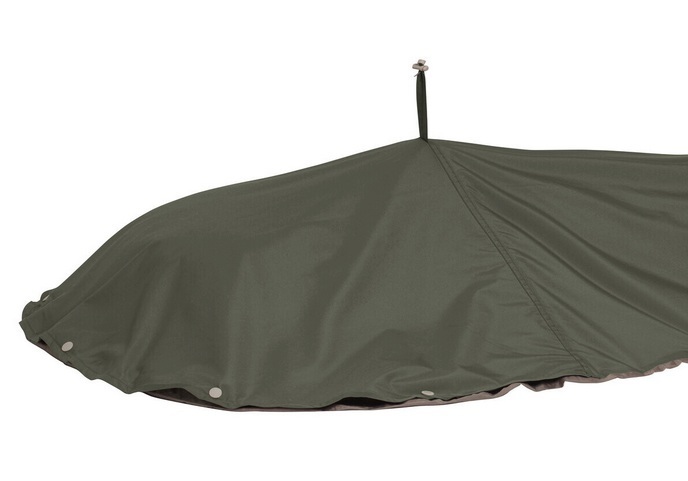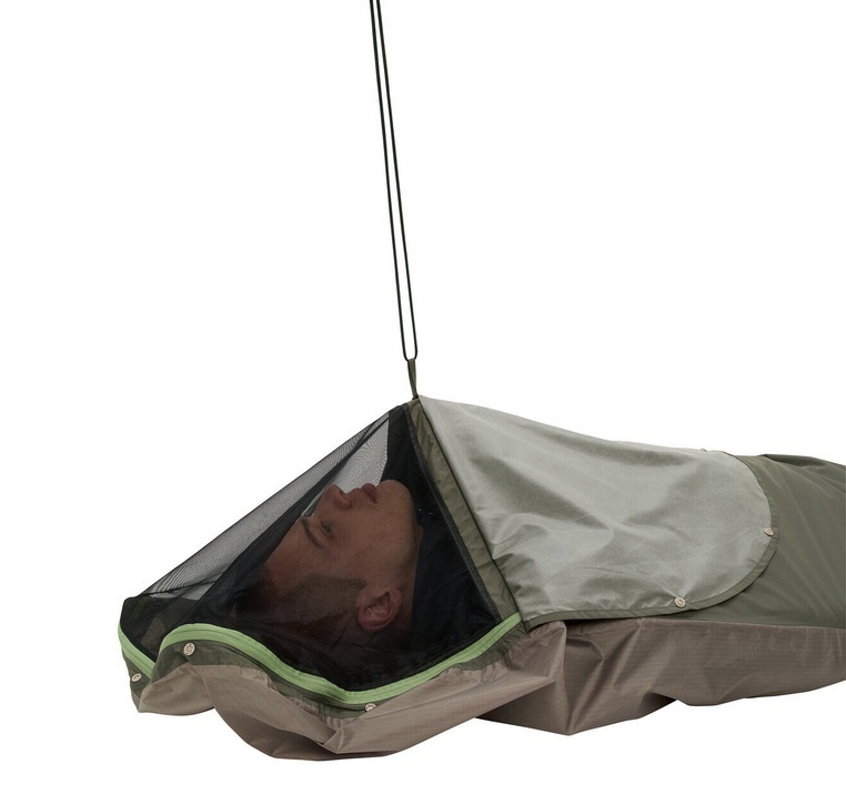 The breathable top efficiently wicks away moisture, and the bottom is made of durable tent floor material. An integrated mosquito net in the face area keeps bugs away. The headroom can be adjusted with an attachment loop and an additional cord to keep the bag at a comfortable distance from your face.