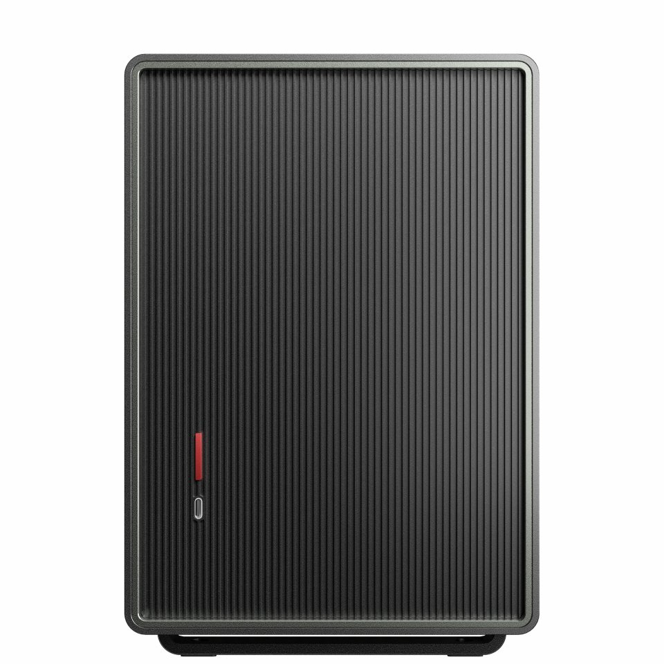 Kotelo koostuu alumiinisista sivupaneeleista ja CNC-koneistetusta rungosta, jotka takaavat hyvän kestävyyden ja hillityn metallipinnan. Musta väri ja minimalistinen muotoilu sopivat monenlaisiin ympäristöihin ilman ylimääräistä huomiota herättävää ilmettä.