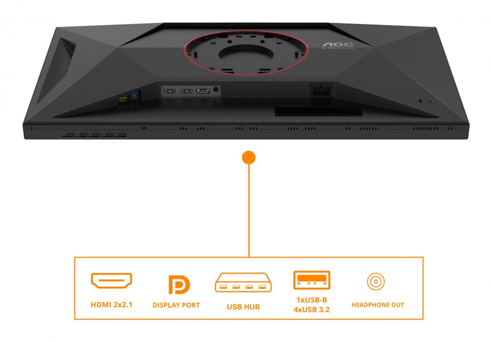Liitäntöjen osalta näyttö tarjoaa yhden HDMI 2.1 -portin, yhden DisplayPort 1.4 -liitännän sekä kuulokeliitännän. USB-keskus sisältää yhden USB B-tyypin upstream-portin ja neljä USB A-tyypin downstream-porttia, kaikki versioltaan 3.2 Gen 1 (3.1 Gen 1). Tämä mahdollistaa monipuolisen laiteyhteyksien hallinnan.
