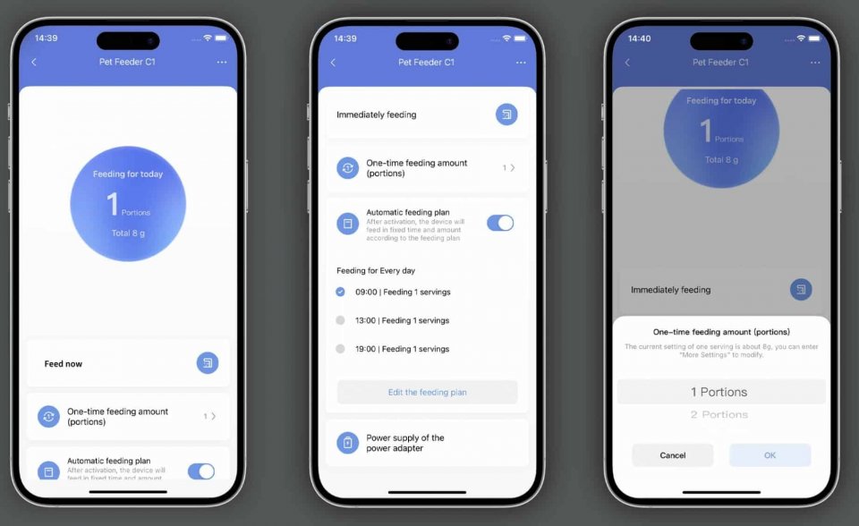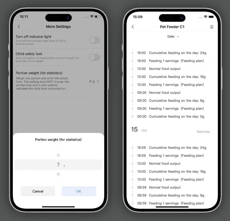 Aqara Pet Feeder ruokintalaitteella voit hallita lemmikkisi ruokintaa etänä ollessasi matkoilla, töissä tai rentoutumassa sohvalla. Laite tukee ruokintasuunnitelmia ja aikatauluja, jotta lemmikkisi pysyy terveenä ja tyytyväisenä. Aikataulut toimivat, vaikka internet yhteys katkeaisi tai Zigbee keskitin lakkaisi toimimasta. Ruokintalaitteen avulla voit tarkkailla päivittäistä ruokinnan määrää grammoina ja saada tilastoja lemmikkisi ruokinnasta. Näin varmistat, että lemmikkisi saa aina oikean määrän ravintoa. Siinä on 4 litran ruokasäiliö, joten se sopii niin kissojen kuin koirien ruokintaan ja se voi sisältää jopa 1,7 kg lemmikinruokaa.