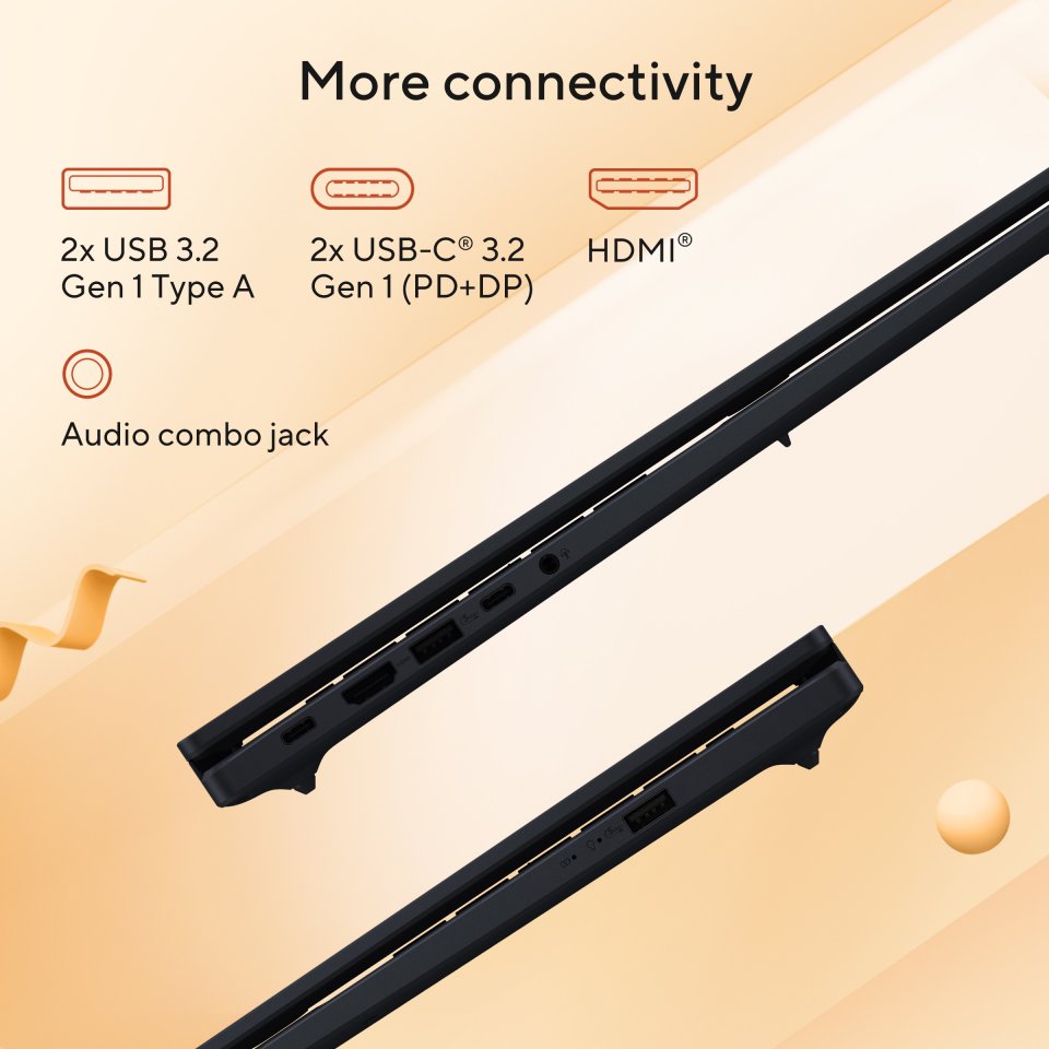 Vivobook 18 hyödyntää AMD Ryzen AI 5 430 ‑suoritinta, jossa on integroitu AMD XDNA NPU jopa 50 TOPSin tekoälylaskentaa varten. Tehokas 16 Gt DDR5 ‑muisti ja nopea 512 Gt PCIe 4.0 SSD ‑tallennustila pitävät työnkulun sulavana. Wi‑Fi 6 (2×2) tarjoaa nopeat ja vakaat verkkoyhteydet niin kotiin kuin toimistoon. Laitteen Windows Hello ‑yhteensopiva FHD‑IR‑kamera yksityisyyssuojalla tekee kirjautumisesta turvallista ja vaivatonta.